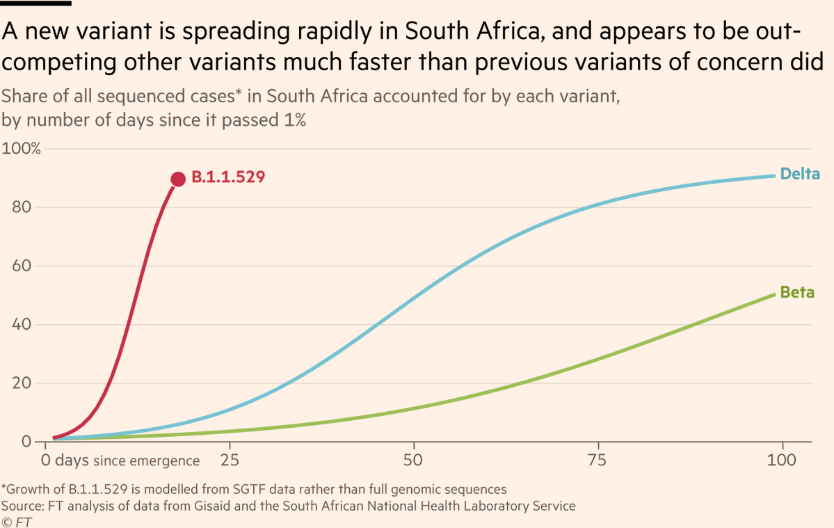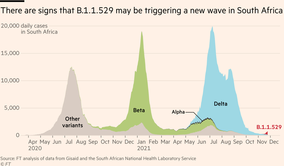 The graph above from the Financial Times shows that Omicron spread rapidly in South Africa, even faster than the Delta variant. It quickly accounted for a major share of new cases within days of emergence, much faster compared to Delta or Beta.
