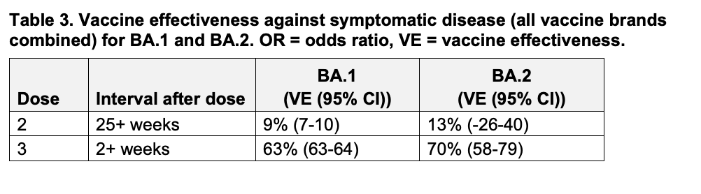 While 2 doses have limited protection against symptomatic disease from both BA.1 and BA.2, getting a booster shot significantly improves that protection for both BA.1 (63%) and BA.2 (70%). So yes, the vaccines continue to work against BA.2.
